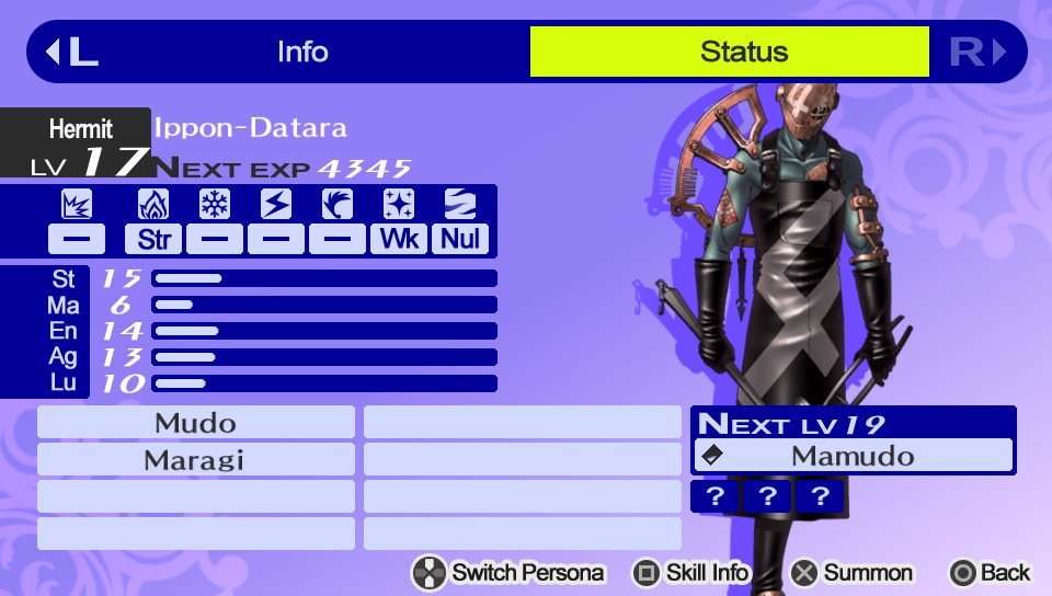 Ippon-Datara is a Persona of the Hermit arcana. It specializes in Darkness element attacks. Its default level is 17.