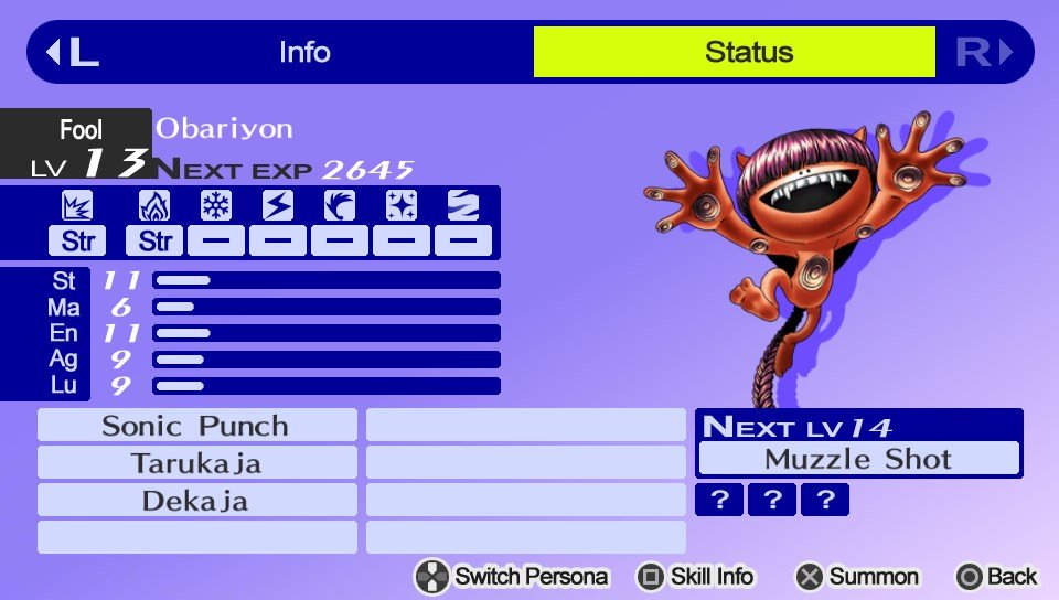 Obariyon is a Persona of the Fool Arcana. It specializes in Physical attacks. Its default level is 13.