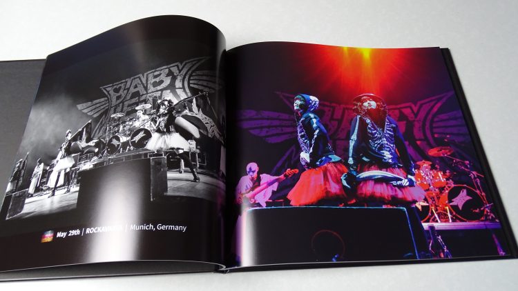 The photobook is a hardcover book with many fantastic images of BABYMETAL during their 2015 world tour. A date and location stamp is posted throughout the book.