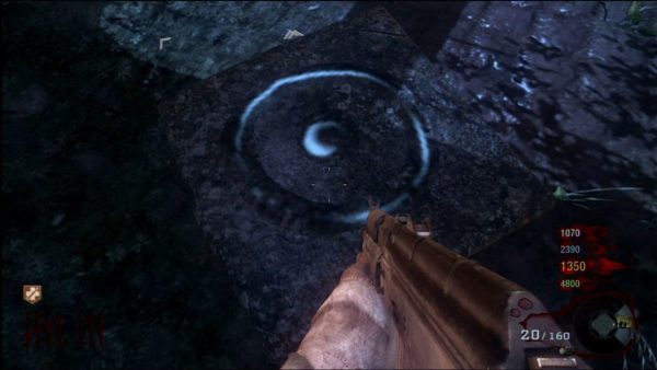 A few new transportation devices can be found around the map. The first obvious one will be the sharpened sticks that come up when walking out of the starting area. They will always come up after a player or Zombie walks through the door. The sticks do minor damage to players – less than a zombie’s punch. The sticks won’t kill zombies, but they will trap them for a second or two. You can also find a mine cart and water slide that will take you through the map. You can only use these devices after you opened the rooms they lead to. Each ride costs 250 Points for the mine cart. The water slide is free. The water slide takes you to the AK74u room. The mine cart takes you to the waterfall area. Along with these new devices, you can find two geysers on the bottom levels of the map. Stand on the geyser for about three seconds to push you up to the top level.
