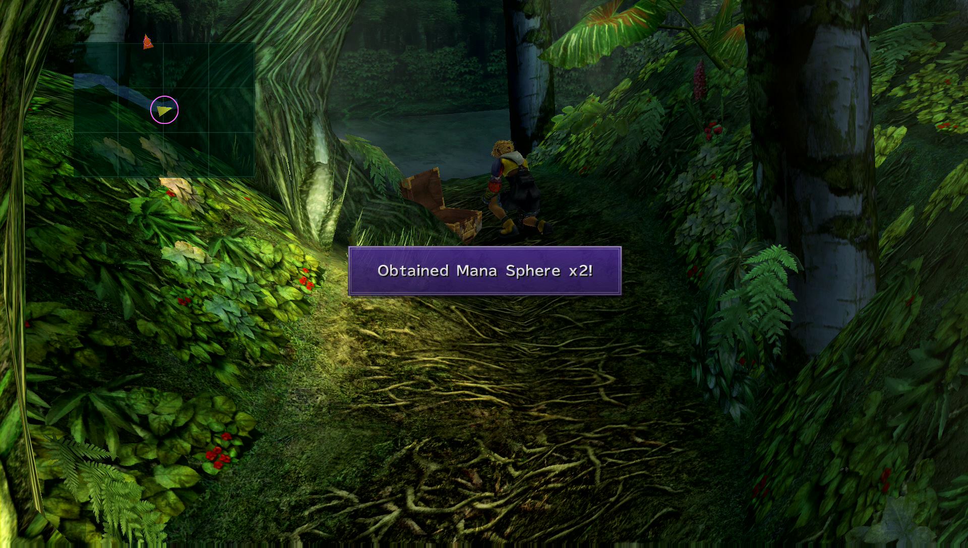 The party will be waiting for you at the forest entrance. After the short cut scene, take the path to the east. This will lead to a dead end with a treasure chest containing two Mana Spheres.