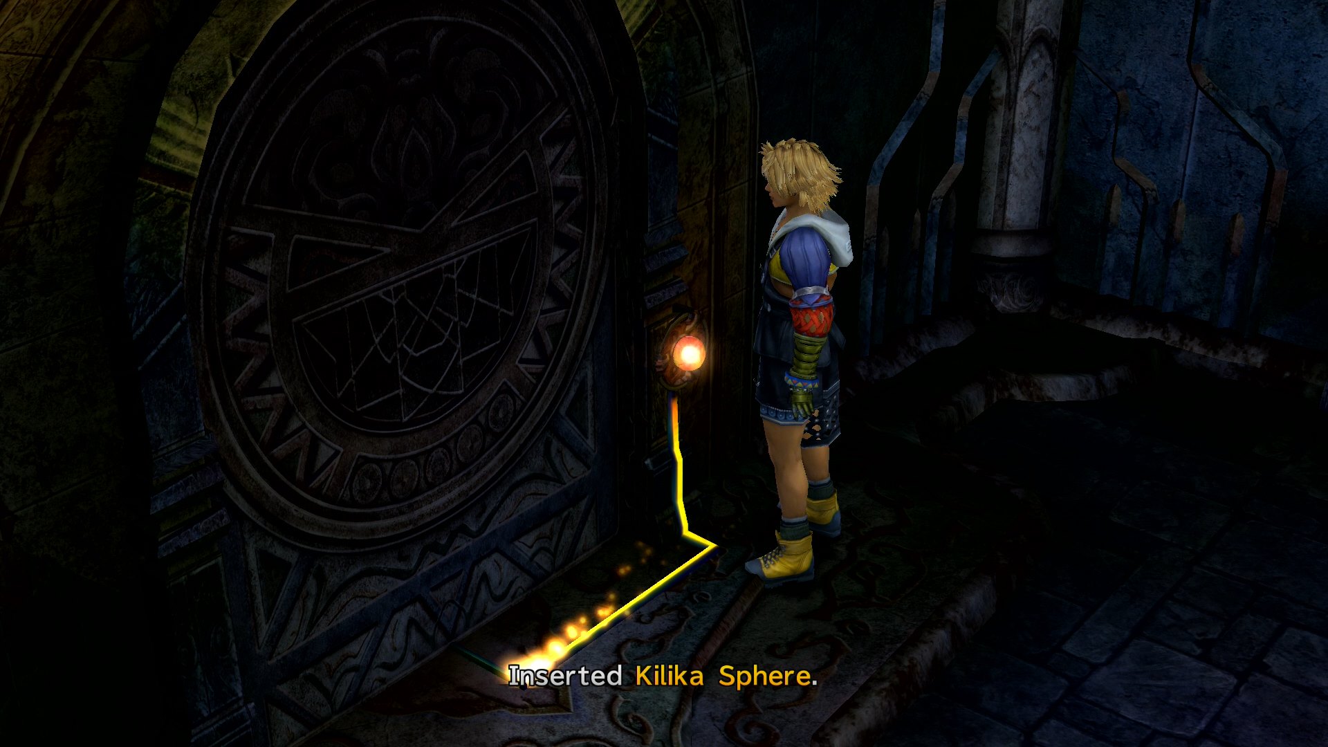 Like the first Cloister of Trials, you must solve a puzzle using Spheres. Take the Kilika Sphere from the pedestal in the front room and place it in the door. This will cause it to burst into flames. Remove it from the door and enter the next room.