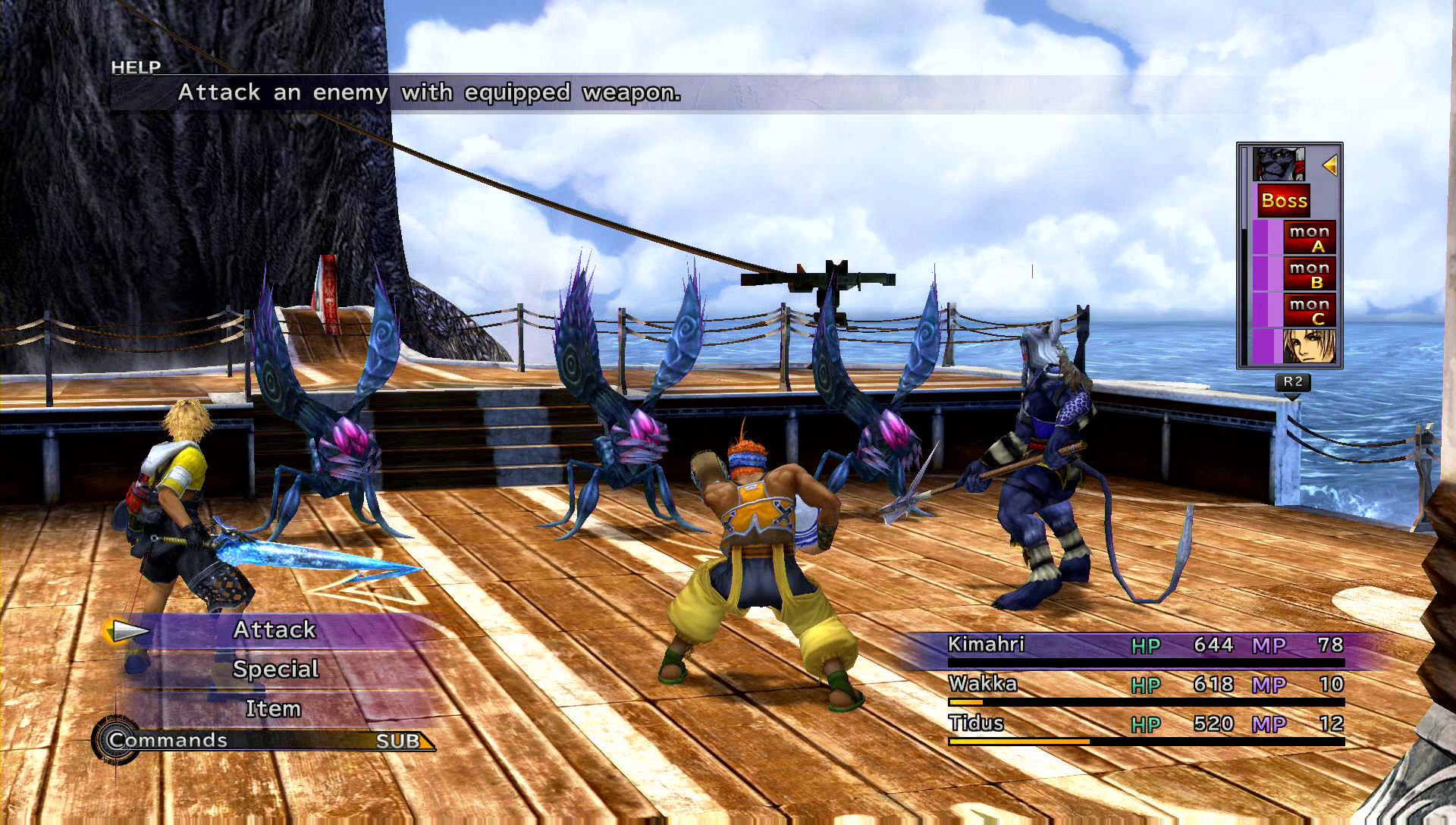 After a lengthy cut scene, you’ll enter a boss battle with Sin – or, a fin of Sin. You won’t be able to reach it with direct attacks. Use Lulu’s Black Magic, Wakka’s Blitzball, and Yuna’s Aeon to hit it from afar.