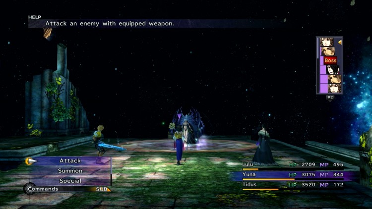 Lady Yunalesca has three forms that you must defeat in succession. The first form will inflict darkness as a counter attack to physical attacks, silence as a counter attack to magic attacks, and sleep as a counter to special moves. Hopefully you have some decent armor equipped that will block these effects. If not, keep Yuna’s Esuna ready. Additionally, she will drain HP from one character and restore her own health.