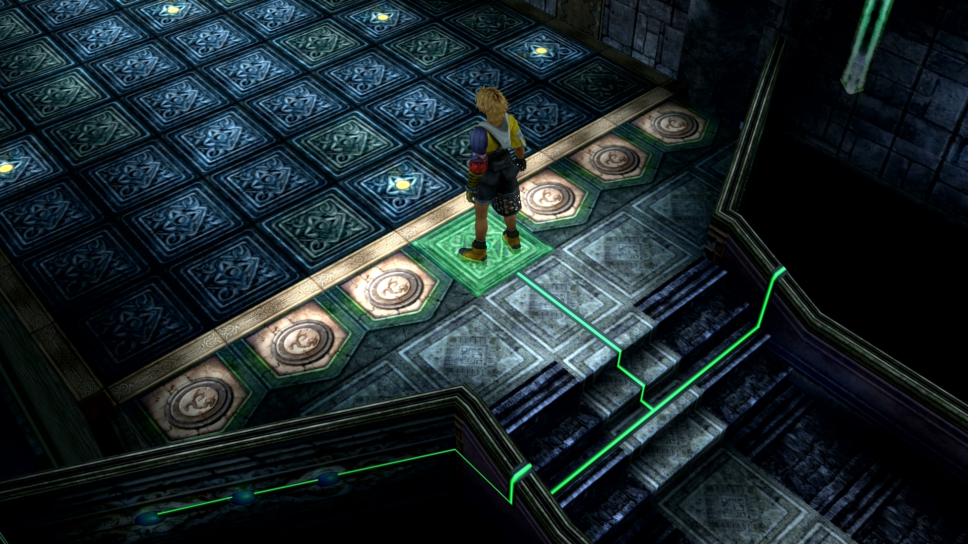 Take the stairs to the south to return to the hall before Yunalesca’s room. Walk down and speak to Auron to learn some more back story.