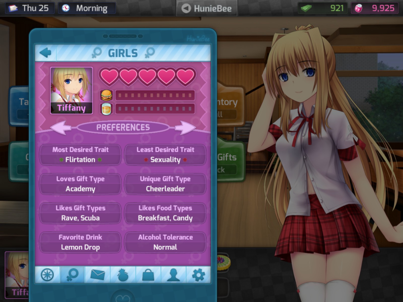 Each girl has their own set of preferences which can be seen in their profile under the ‘Girls’ part of the HunieBee. The five hearts at the top show how close you are to the girl. Successfully take a girl out on a date – reach the affection goal in their puzzle – to earn another heart. Four hearts are needed before starting a night date to sleep with a girl.