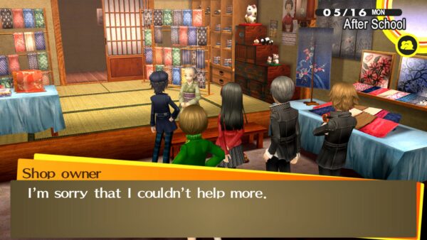 After the story has played out even further, the next kidnapping will occur. Before you can jump in the TV, you’ll have to gather information to find Kanji. First, talk to Kanji’s mother in front of the Textile Shop in Shopping District, North.