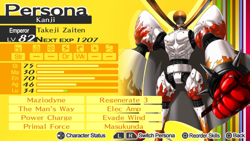 Its level is carried over from Rokuten Maoh as well as all skills. However, once you receive Takeji Zaiten, the persona will learn a new ability called “The Man’s Way” which has a chance to inflict Down/Dizzy on all foes.