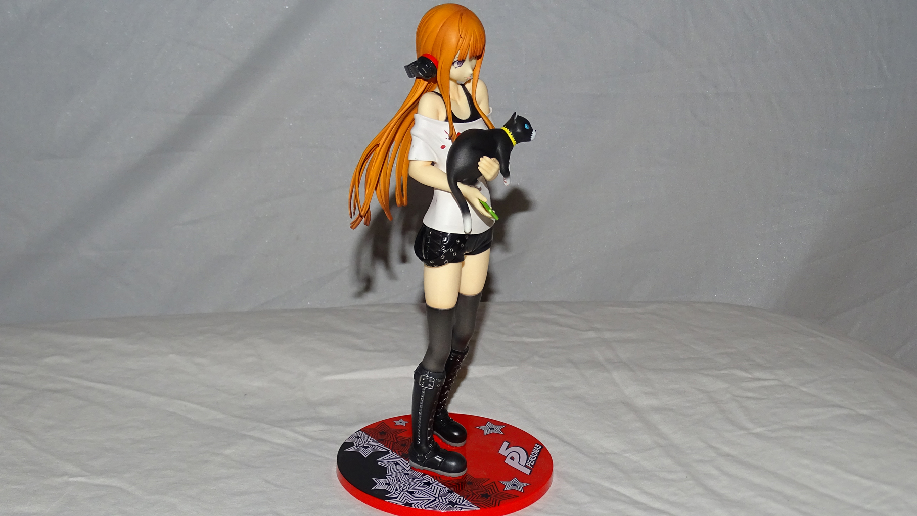 This is a pre-painted, 1/7th scale figure of Futaba Sakura from Persona 5. It was manufactured by Phat!, sculpted by Mitsuru Saito, and originally retailed for around $125 USD. The main figure stands at 220mm tall. It connects to a flashy red base sporting the Persona 5 logo via metallic pegs from the base to holes on the figure’s feet.