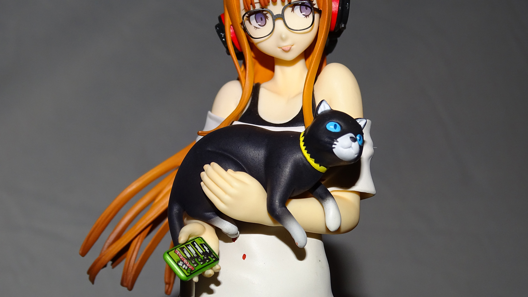 The figure has several pieces included to alter its appearance. There are two pairs of glasses that are made from thin metal, a PVC cat (Morgana), and a total of eight different pieces to create two options for her torso. Futaba Sakura can either wear her hoodie with her arms tucked inside her pockets, or she can fold her arms while wearing a t-shirt.