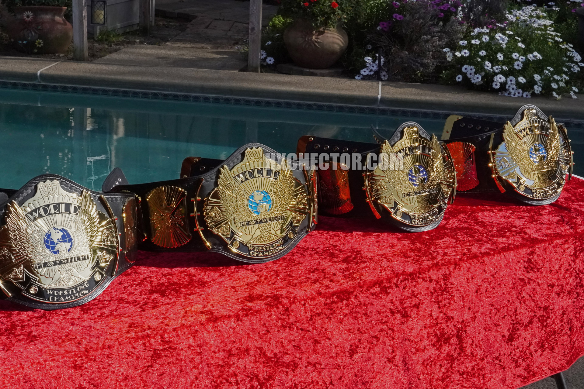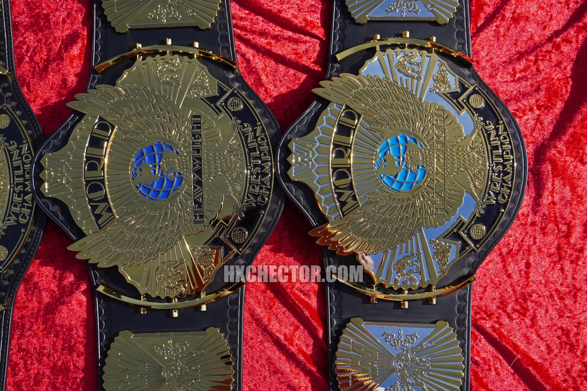 In 2023, a version two of the all gold winged eagle was released, even though it was the third winged eagle replica belt. The version 2 winged eagle is much more similar to the dual plated version than the v1. The version 2 added a curve to the main plate, extended the wings of the eagle on the main plate, added an extra relief piece for the WOLRD banner on the top of the main plate, attached the twisted side bars to the main plate, centered the WWE logos on each plate, and changed the strap. The new strap is a different shape than the V1, much more flexible and soft, covers all screws on the back, and has imprinted designs on the snap boxes as opposed to stitched-on pieces.
